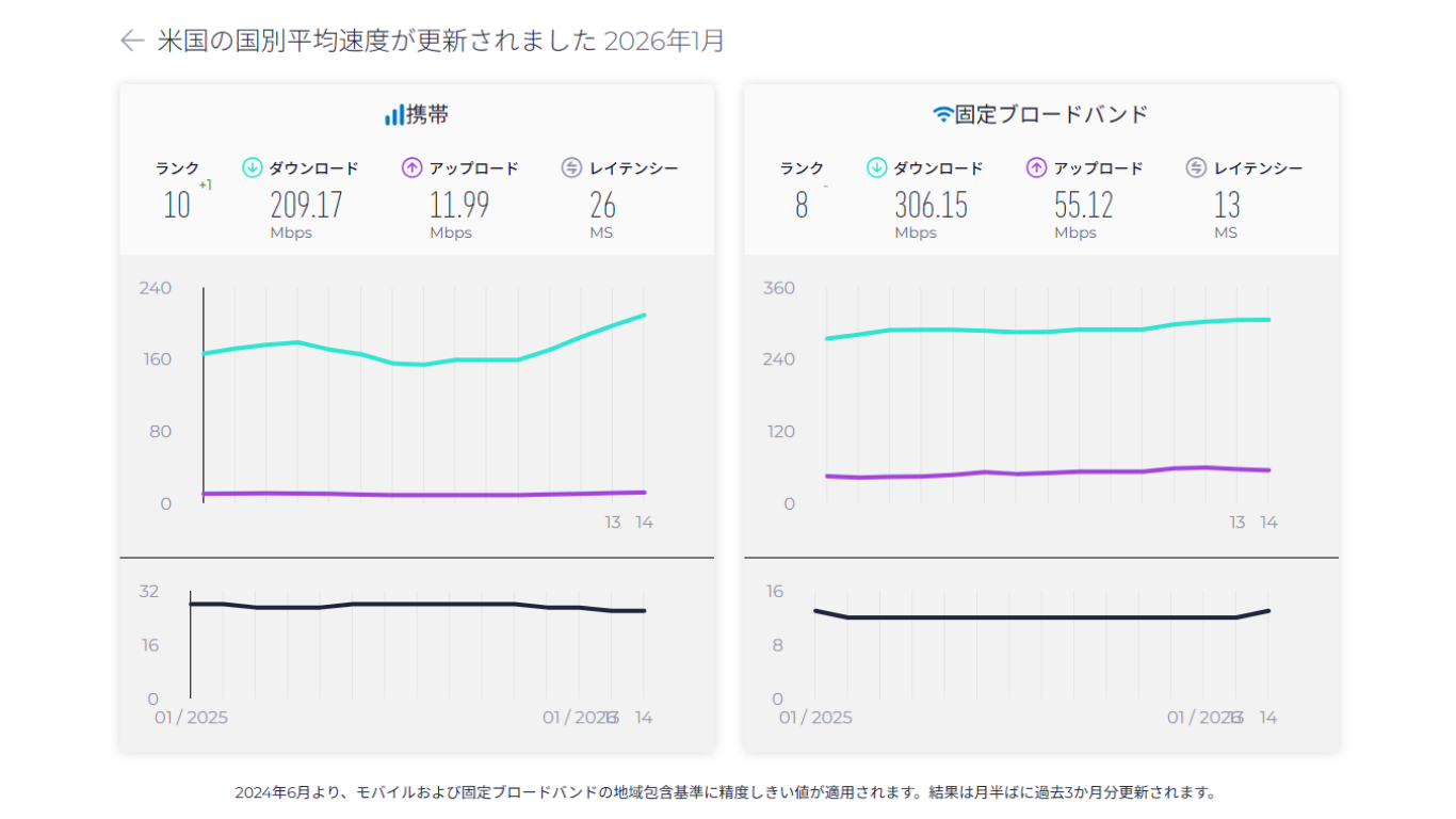 上記は有名な速度チェックサイトである"SPEEDTEST"を利用したダウンロード速度の参考値です。(2026年1月時点)