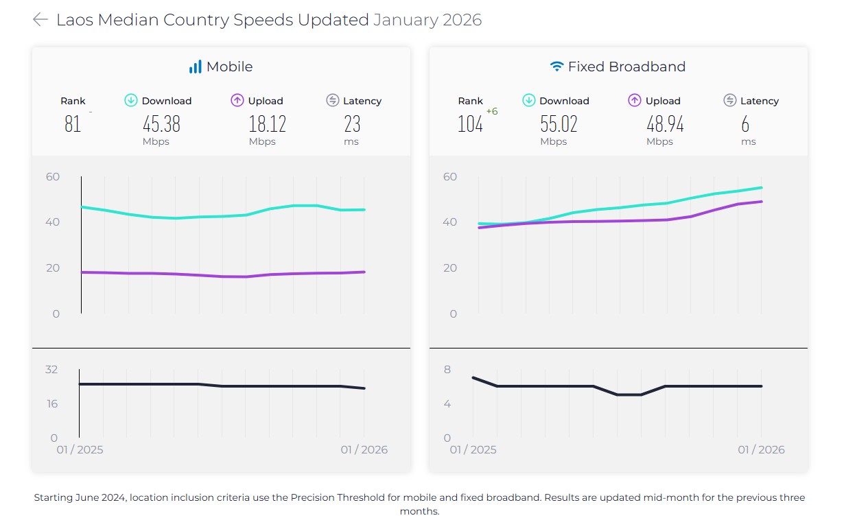 | ラオスの通信速度の中央値 | 45.38 Mbps | 55.02 Mbps |