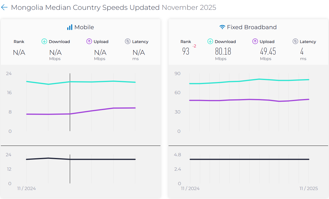 | モンゴルの通信速度の中央値 | N/A Mbps | 80.18 Mbps |