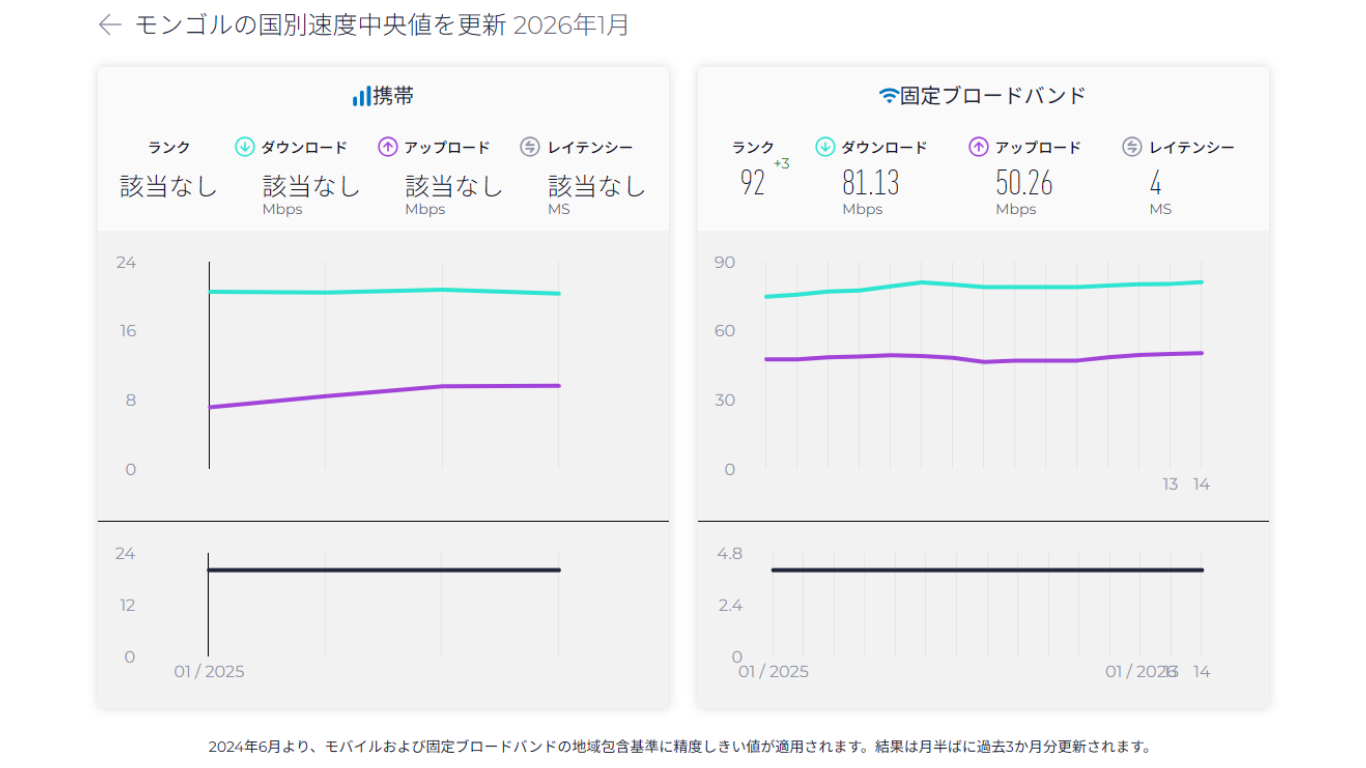 | モンゴルの通信速度の中央値 | N/A Mbps | 81.13 Mbps |