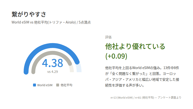 各項目の独自調査で World eSIMが他平均と比べて優れているか劣っているかが一目でわかる円グラフを用いて解説します。World eSIM購入を検討している方はぜひ参考にしてください。